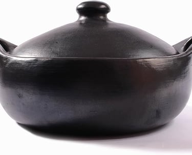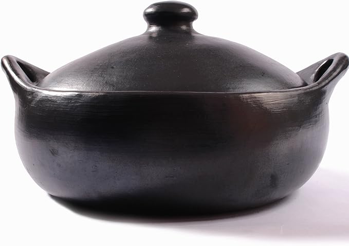 Hecha a mano por artesanos en Colombia, esta exquisita cacerola de barro negro sin esmaltar se puede usar en el microondas o en el horno, pero no debe lavarse en el lavavajillas.